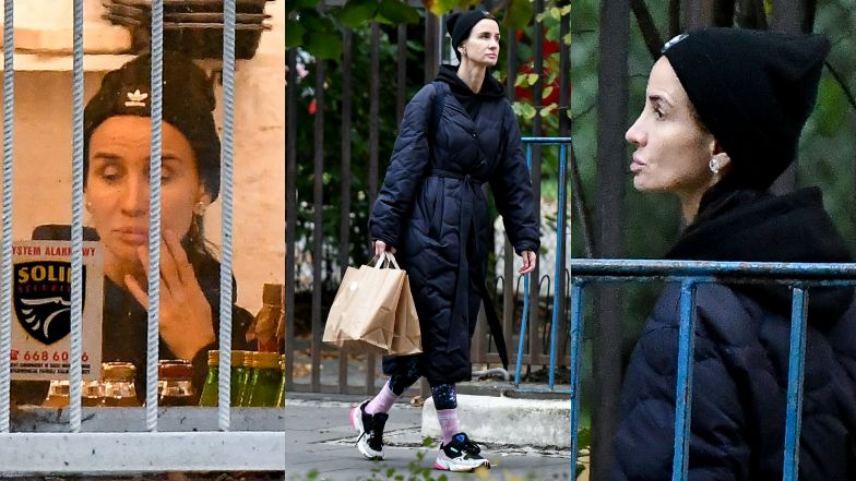 Tym razem Suri Cruise wyciągnęła z garderoby swobodne niebieskie dżinsy typu cargo oraz zieloną puchową kurtkę, pod którą znajduje się szary sweter. Dopasowała do nich czarne tenisówki. Zimową stylizację uzupełnia oversize'owy wzorzysty szalik.