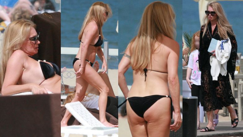 50-latka na plaży pojawiła się w kusym, czarnym bikini, udowadniając, że mimo upływu lat, wciąż może pochwalić się nienaganną sylwetką.