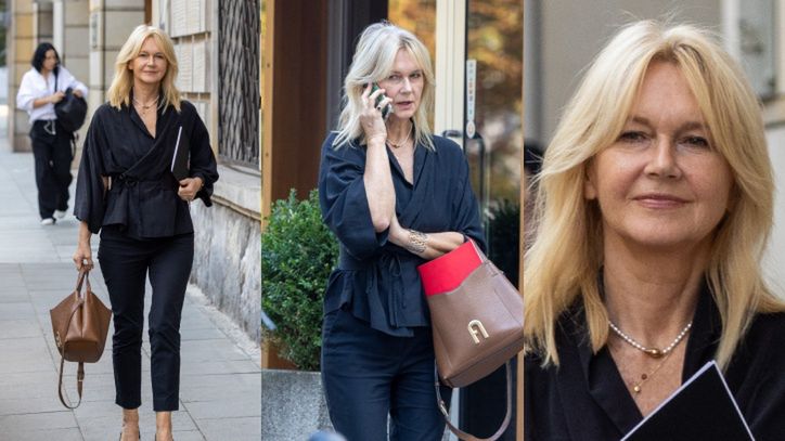 Nie inaczej było w czwartek, gdy ikona telewizji dała się sfotografować podczas przechadzki ulicami Warszawy. 65-latka raz jeszcze udowodniła, że klasyka zawsze się obroni, zadając szyku w czarnym komplecie składającym się z jedwabnej koszuli i szykownych spodni-cygaretek. Celebrytka urozmaiciła prostą, acz efektowną stylizację przy pomocy skórzanej torebki oraz pasujących czółenek w pepitkę. Na jej twarzy zagościł delikatny makijaż.