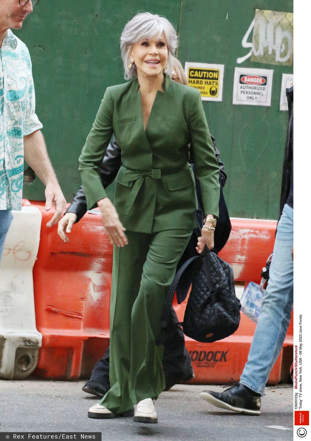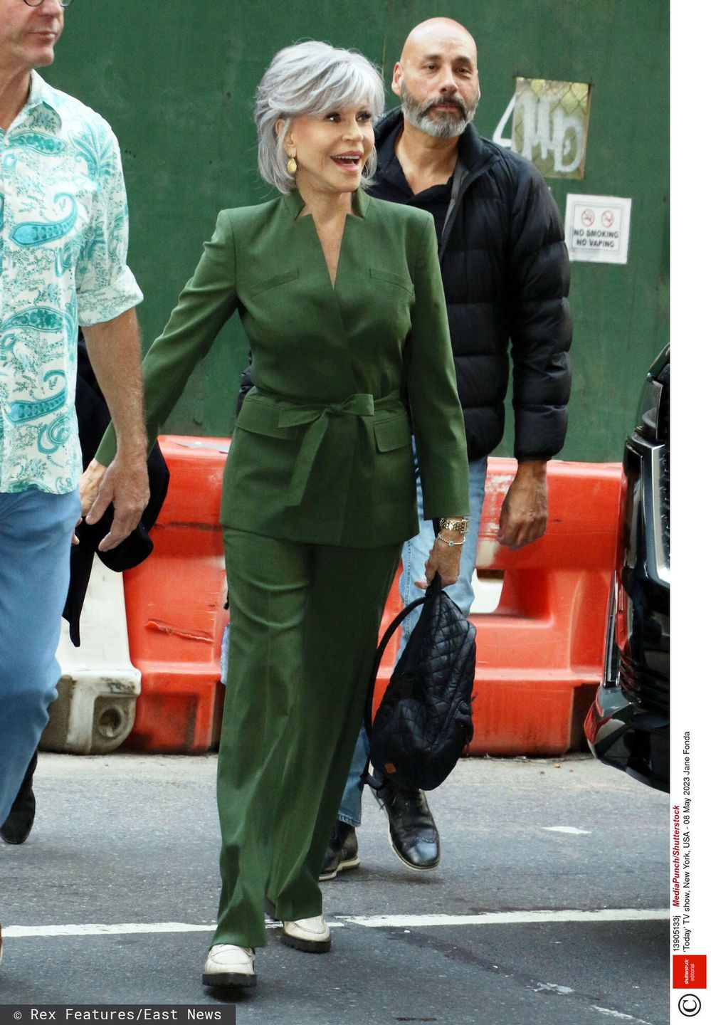 W związku z premierą filmu "Pozycja obowiązkowa 2", w którym jedną z głównych ról gra Fonda, gwiazda była gościem programu śniadaniowego "Today". 85-latka zaprezentowała się w ciemnozielonym komplecie. Stylizacja składała się z luźnej przepasanej marynarki i prostych spodni w kant. W kwestii dodatków zdecydowała się na białe skórzane mokasyny i czarny pikowany plecak.
