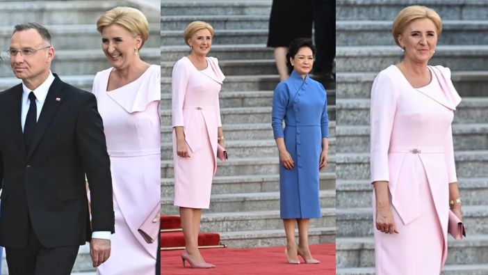 Kilka godzin później małżonce Andrzeja Dudy nadarzyła się kolejna sposobność, by udowodnić niedowiarkom, że potrafi zachwycić aparycją i godnie reprezentować nasz kraj za granicą. Podczas spotkania w Wielkim Pałacu Ludowym w Pekinie Agata zaprezentowała się w dość fantazyjnej, jak na siebie, kreacji - bladoróżowej sukni z asymetryczną baskinką i marszczeniem przy dekolcie. Dopełnieniem stylizacji były dodatki w pasującym odcieniu - kopertówka oraz czółenka. Krótkie blond włosy 52-latki tradycyjnie zaczesane były do tyłu.