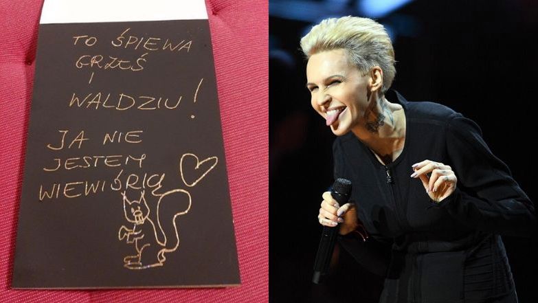 "To śpiewa Grześ i Waldziu! Ja nie jestem wiewiórką!" - oświadczyła za pomocą fotografii przedstawiającej szkic leśnego zwierzęcia.