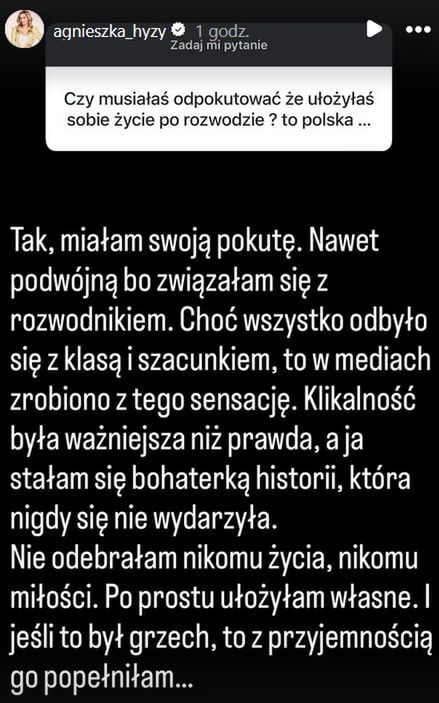 Tak, miałam swoją pokutę. Nawet podwójną, bo związałam się z rozwodnikiem. Choć wszystko odbyło się z klasą i szacunkiem, to w mediach zrobiono z tego sensację. Klikalność była ważniejsza niż prawda, a ja stałam się bohaterką historii, która nigdy się nie wydarzyła. Nie odebrałam nikomu życia, nikomu miłości. Po prostu ułożyłam własne. I jeśli to był grzech, to z przyjemnością go popełniłam... - odpisała z pełnym przekonaniem.