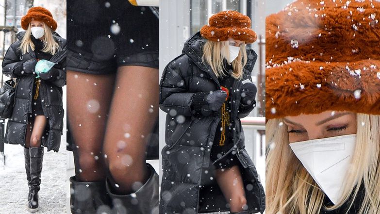 Teraz z kolei paparazzi wypatrzyli Agnieszkę Woźniak-Starak, która przemierzała zasypane śniegiem ulice w szortach i cienkich rajstopach. Dziennikarka, często chwalona za wyczucie trendów, pokazała się w stylizacji złożonej z krótkich spodenek, kozaków pod kolano, swetra i obszernej, pikowanej kurtki. Na głowie miała futrzany kapelusz w rudym kolorze.