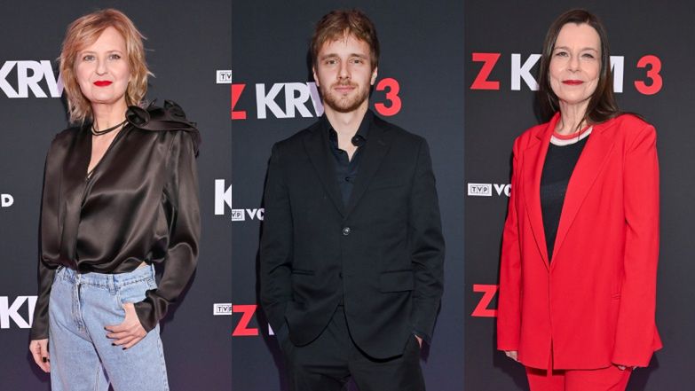 Aktorzy serialu "Krew z krwi" promują nowy sezon: Agata Kulesza w czerwonym garniturze, Izabela Kuna, Maciej Musiał
