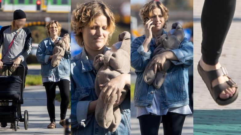 Aleksandra Domańska w luźnym stroju i sandałach spaceruje z dzieckiem i partnerem. Macierzyństwo jej służy? (ZDJĘCIA)