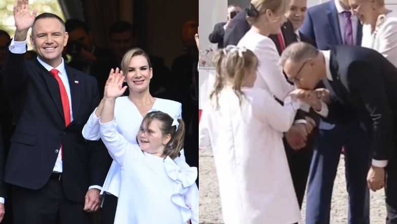 Andrzej Duda z żoną powitali nową parę prezydencką wraz z dziećmi. Były prezydent pocałował dłoń Marty Nawrockiej, a następnie ten sam gest wykonał w kierunku Kasi Nawrockiej.