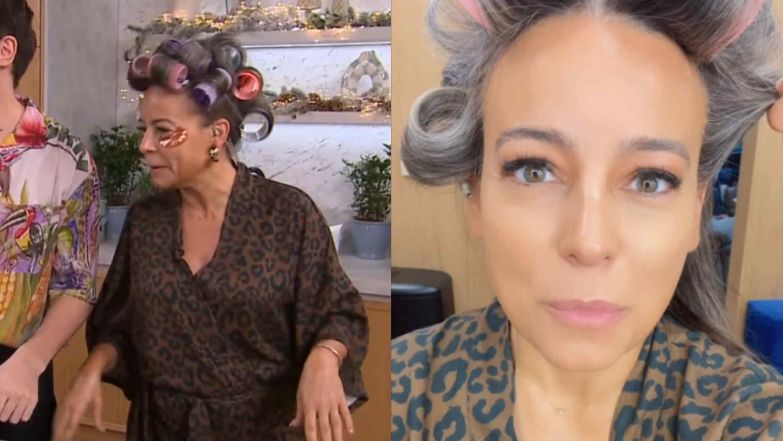 Anna Mucha w wałkach i panterkowym szlafroku