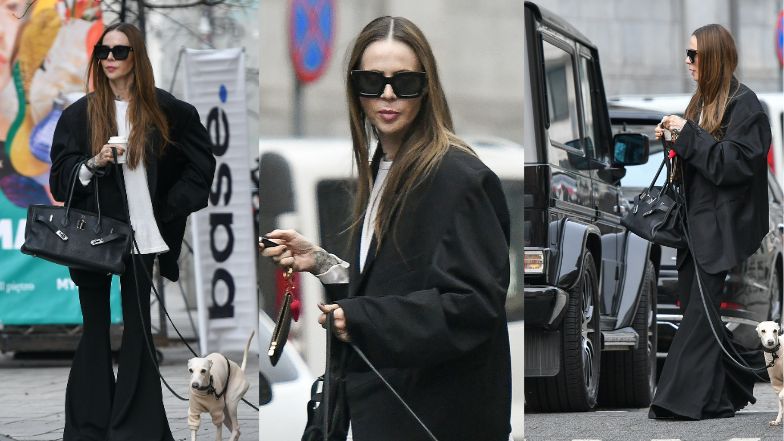 Celebrytka postawiła na charakterystyczną dla siebie, prostą stylizację utrzymaną w ciemnej kolorystyce.