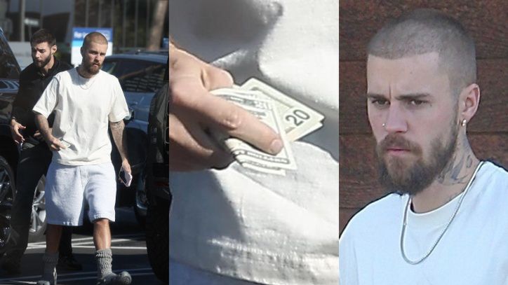 Brodaty Justin Bieber parkuje na miejscu na niepełnosprawnych i pędzi z plikiem pieniędzy po kawusię