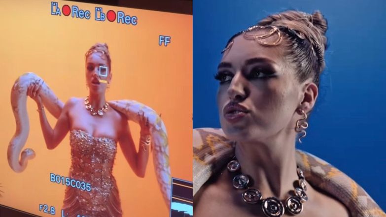 22-latka zaprezentowała się cała w złocie i włożyła tematyczne kolczyki. To jednak nie koniec nawiązań do tytułowego węża, bo na opublikowanym w niedzielę nagraniu wije się w towarzystwie prawdziwego zwierzęcia. Caroline z zarzuconym na szyję gadem uskutecznia pląsy w rytm utworu i wykonuje jego fragment. W instagramowej relacji obwieściła także, że bardzo się bała z nim pracować.