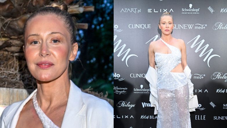 45-latka, która doskonale odnajduje się na ściankach, zadbała o to, by jej stylizacja zwróciła uwagę licznie zgromadzonych fotoreporterów. Kasia zaprezentowała się bowiem tym razem w oryginalnej, cekinowej sukience na jedno ramię. Uwagę zwracało także wycięcie w talii, dzięki któremu zebrani mogli oglądać jej szczupły brzuch.