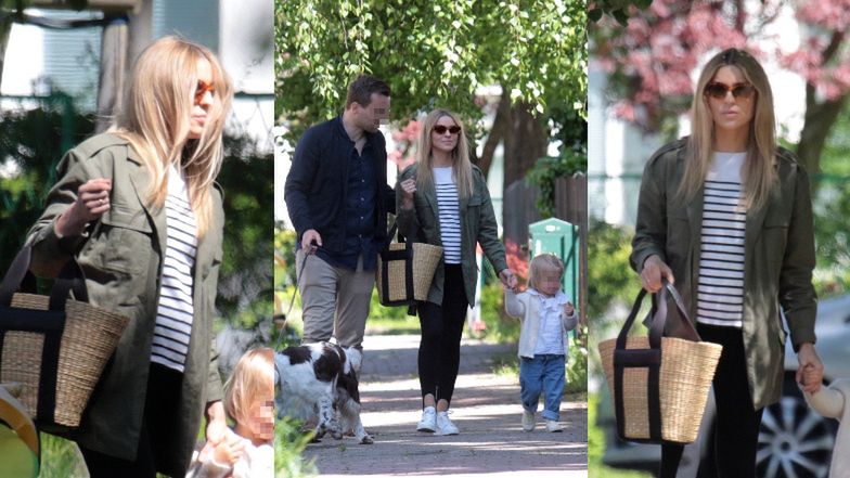 Jakiś czas temu przyszła mama dwójki dzieci została przyłapana przez paparazzi, gdy wraz z córką i małżonkiem zmierzała do swojego trójmiejskiego domu. Jak zwykle towarzyszył im ukochany pies Portos. I tym razem 34-latka postawiła na charakterystyczną dla siebie, casualową stylizację, na którą składały się czarne legginsy, t-shirt w paski i zielona parka. Wzrok przykuwał widoczny brzuszek wyzierający spod bluzki.