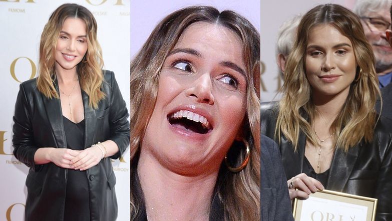 Ciężarna Marta Żmuda Trzebiatowska stroi miny w skórzanej marynarce na rozdaniu nominacji do Orłów (ZDJĘCIA)