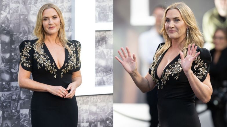 48-latka wzięła udział w premierowym pokazie biografii zorganizowanym w londyńskim kinie Odeon Luxe Leicester Square. Kate Winslet przyciągała uwagę w efektownej czarnej sukience z głębokim dekoltem wzbogaconej złotymi elementami układającymi się w kwiatowy wzór. Filmowa gwiazda zaprezentowała się w subtelnym makijażu i falujących blond włosach, stanowiących jeden z jej znaków rozpoznawczych.