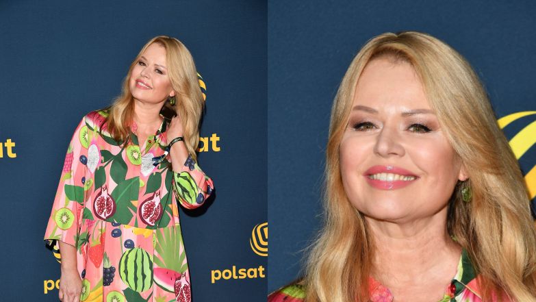 Na konferencji ramówkowej Polsatu Magdalena Wójcik zaprezentowała się w kolorowej stylizacji. Aktorka wybrała różową kreację w print kwiatów, liści i egzotycznych owoców, którą uzupełniła o kolorowe dodatki. 54-letnia gwiazda postawiła na zielone sandałki na platformie oraz dopasowaną kolorystycznie torebkę.