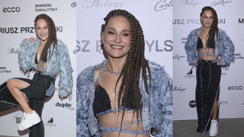 Ostatnio zaszczyciła swoją obecnością pokaz Mariusza Przybylskiego, na którym pozowała w dżinsowej, recyklingowej kreacji zaprzyjaźnionej marki modowej. Do topu przypominającego górę od bikini artystka dobrała szerokie spodnie z rozcięciami i efektowną kurtkę ze skrawków.