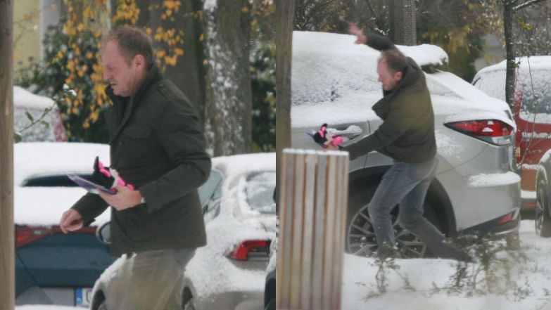 Donald Tusk maszeruje do zaśnieżonego auta za 350 tysięcy złotych. Był o krok od bolesnego UPADKU! (ZDJĘCIA)
