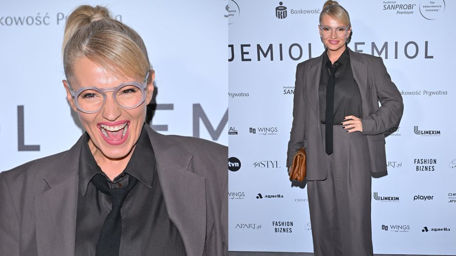 Dorota Szelągowska na pokazie mody Łukasza Jemioła zaprezentowała się w oversizowym garniturze, do którego dobrała koszulę oraz czarny krawat. Całość dopełniły buty z noskiem w szpic oraz brązowa torebka. Widać, że projektantce wnętrz tego wieczoru dopisywał humor. Na ściance zaprezentowała serię min.