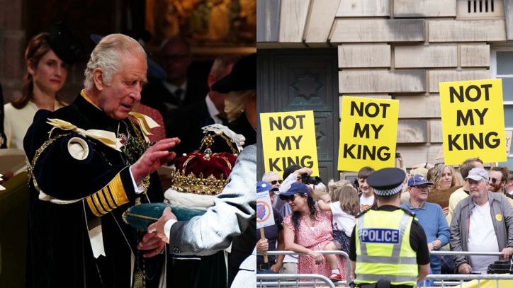 Zgodnie z przewidywaniami na ulicach Edynburga zaroiło się od gapiów, nie wszyscy jednak przybyli na miejsce, by oddać cześć królowi. W tłumie, który zebrał się przed pod budynkiem Sądu Najwyższego, dostrzec można było wielu protestujących, którzy po marszu wzdłuż Royal Mile skandowali "To nie mój król" oraz rozdawali przechodniom naklejki.
