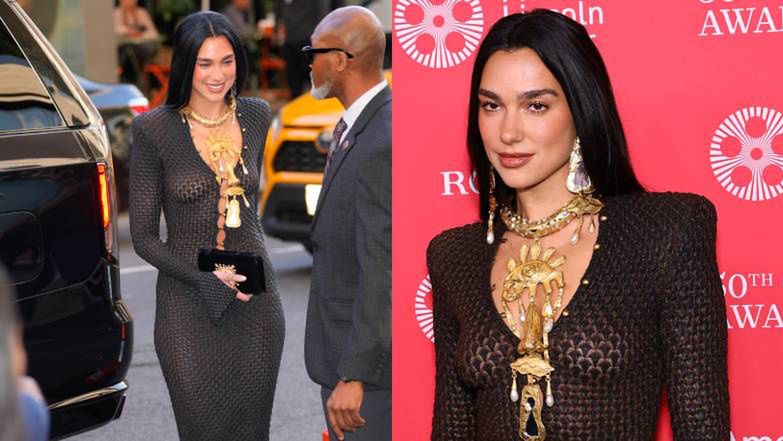 Tym razem piosenkarka znalazła chwilę, by wpaść na galę w Nowym Jorku. Nie da się ukryć, że zrobiła oszałamiające wrażenie. Dua Lipa zaprezentowała się w prześwitującej kreacji, którą zestawiła ze szpilkami i złotą biżuterią.