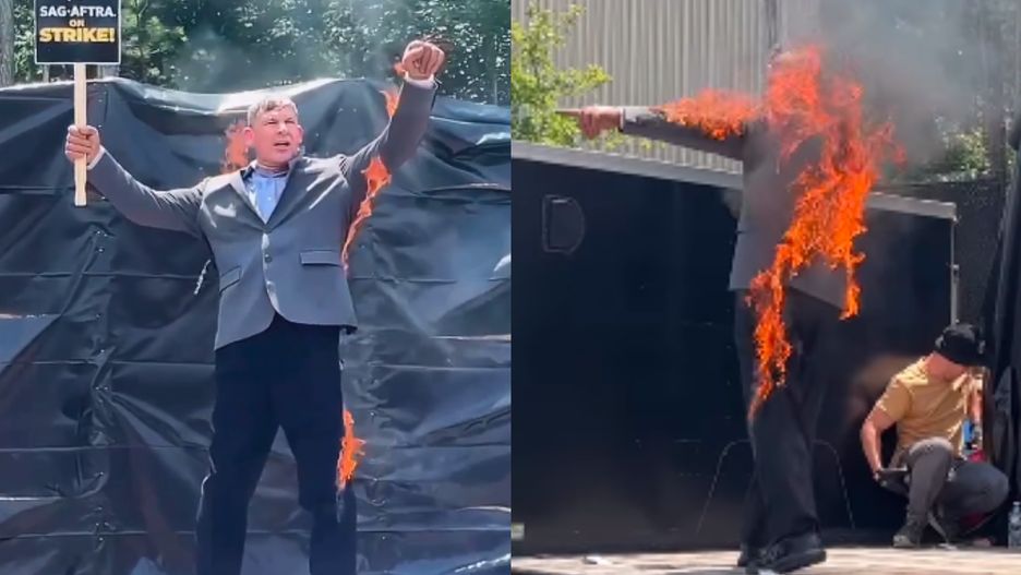 Trwają protesty przeciwko warunkom zatrudnienia w branży filmowej. Mike Massa, dubler Harrisona Forda, pojawił się na scenie z transparentem i w pewnym momencie stanął w płomieniach. "Chcemy, żebyście w nas uwierzyli".