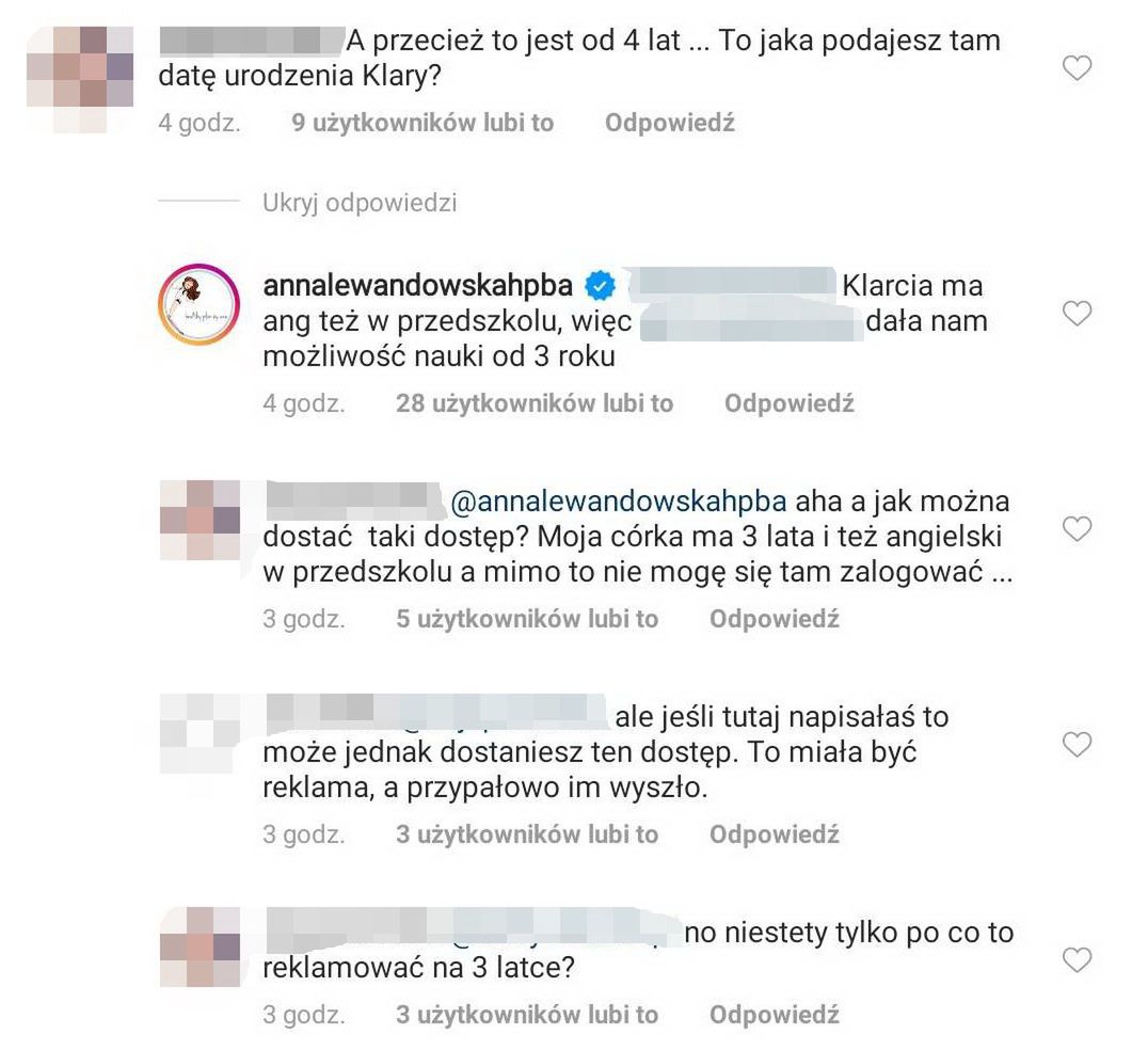 Pod wpisem Lewandowskiej pojawił się w końcu również komentarz szkoły języka angielskiego, którą zareklamowały Klara z mamą. Zgodnie z treścią wpisu, rzeczywiście jest możliwe, aby dziecko przed 4 rokiem życia zostało przyjęte na kursy, aczkolwiek dzieje się tak zazwyczaj w przypadku dzieci "wychowujących się w otoczeniu języka obcego".