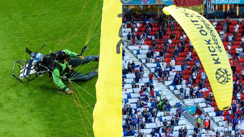 Jak poinformowała niemiecka gazeta Bild, mężczyzna to aktywista Greenpeace'u, a nietypowe lądowanie było wyrazem protestu przeciwko Volkswagenowi, który sponsoruje turniej.