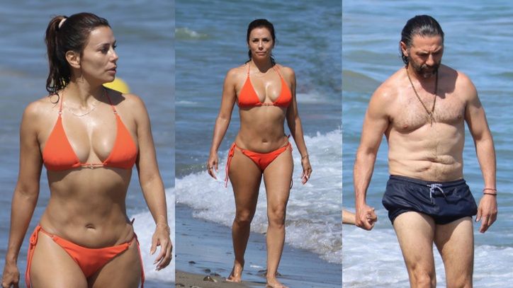 Eva Longoria w pomarańczowym bikini eksponuje talię klepsydry, uskuteczniając "plażing" z mężem (ZDJĘCIA)
