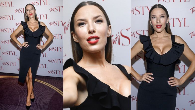 Na tę okazję Ewa zadbała również o to, by jak najlepiej zaprezentować się na ściance. Trenerka postawiła na czarną dopasowaną sukienkę z ozdobną falbaną przy odważnym dekolcie. Całość zestawiła z czarnymi szpilkami i wyrazistym makijażem. Pierwsze skrzypce grały tutaj podkreślone na czerwono usta i zaróżowione lica.