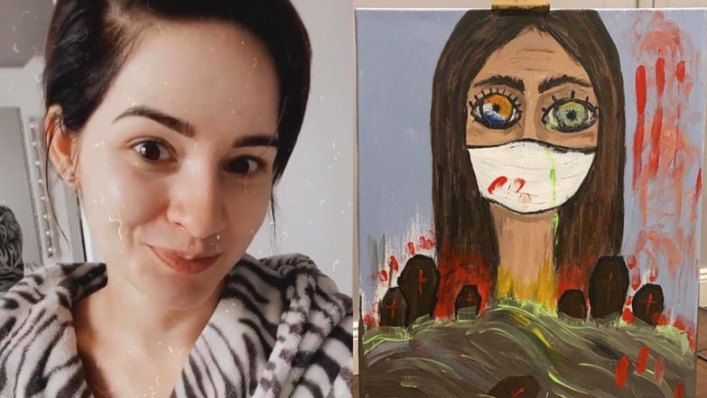 Już kilka godzin później mogliśmy podziwiać efekt malarskiego zapału celebrytki. Dość spokojnie zapowiadający się krajobraz Lisowska przekształciła w wizję płonącego cmentarza, nad którym unosi się ogromna postać kobiety z twarzą ukrytą w masce chirurgicznej. Żeby nadać dziełu odrobiny wigoru, Ewelina postanowiła również pomazać płótno czerwoną farbą imitującą ślady zakrzepniętej krwi.