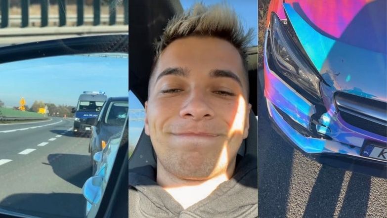 Pierwszy dzień w Polsce. Ja pierdzielę, w ogóle pewnie będzie moja wina. Chociaż ja nie czuję się w ogóle winny, dlatego że jest uderzenie z przodu, a zawsze jak jest z przodu, to wiadomo, jak to wygląda z winą. Ja nie czuję się winny, bo pan mi zajechał drogę, wbił mi się strasznie tak bez kierunkowskazu, jakby nie popatrzył w lusterko. Mam w sumie nagranie z kamerki no i zobaczymy. Zaraz przyjedzie policja, lipa - relacjonował na InstaStories, prezentując fanom uszkodzony pojazd.