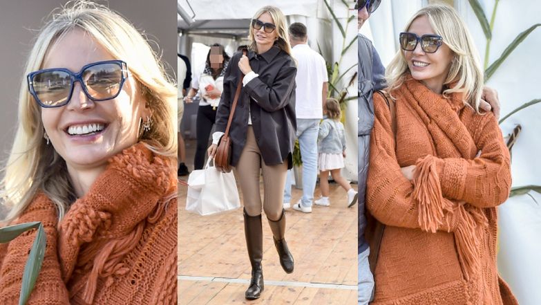 Agnieszka doskonale przygotowała się na wydarzenie, wskakując w profesjonalny strój jeździecki. Nie mogło zabraknąć więc eleganckich bryczesów, które podkreślały jej szczupłe nogi. Na stopach zaś lśniły wypastowane oficerki. Szykowny outfit uzupełniła biała koszula i szara narzutka, którą Woźniak-Starak zamieniła w pewnym momencie na obszerny, rdzawy sweter, który przypominał koc.