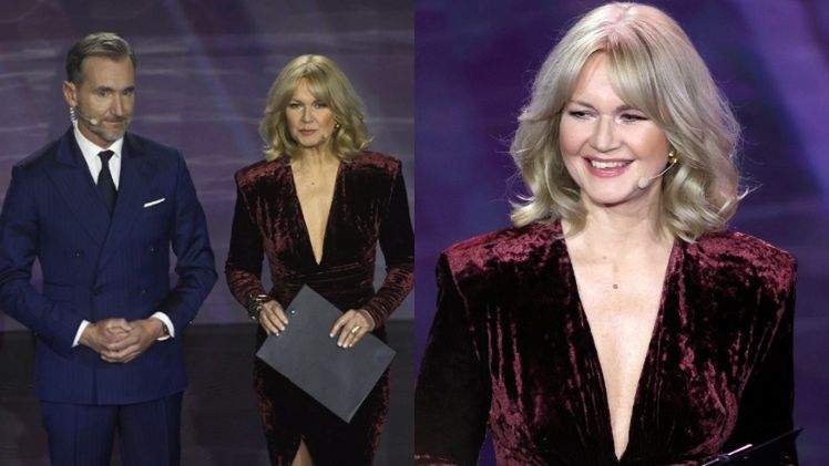 Galę poprowadzili Grażyna Torbicka oraz Piotr Kraśko. 64-letnia dziennikarka zadała szyku na scenie i zaprezentowała się w burgundowej sukni wieczorowej z długimi rękawami, mocno wyciętym dekoltem i odważnym rozcięciem, za sprawą którego prezenterka mogła wyeksponować zgrabne nogi.