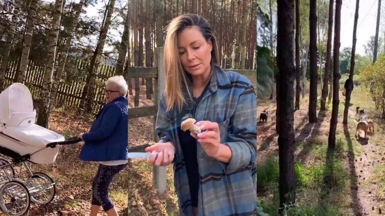 W leśnej przechadzce celebrytce towarzyszyli rodzice, trójka pociech oraz gromadka czworonożnych towarzyszy. "Georguś, a ty znalazłeś jakiegoś grzyba?" - dopytywała Gonia.
