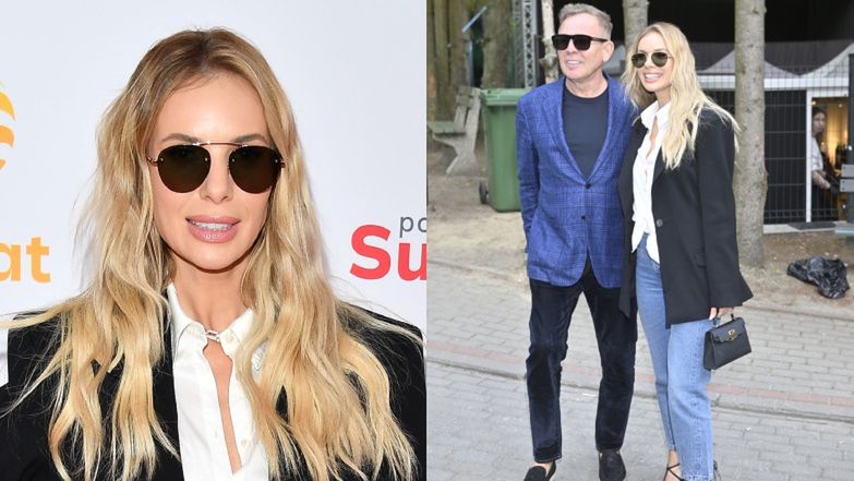 Izabela Janachowska także pojawiła się w jeansach, jednak w nieco jaśniejszych niż mąż. Białą koszulę związała w pasie, a na nią zarzuciła oversize'ową marynarkę. Mocnym akcentem są sandałki na szpilce z futerkiem na piętach oraz torebka od Hermesa za 29 tys. złotych!