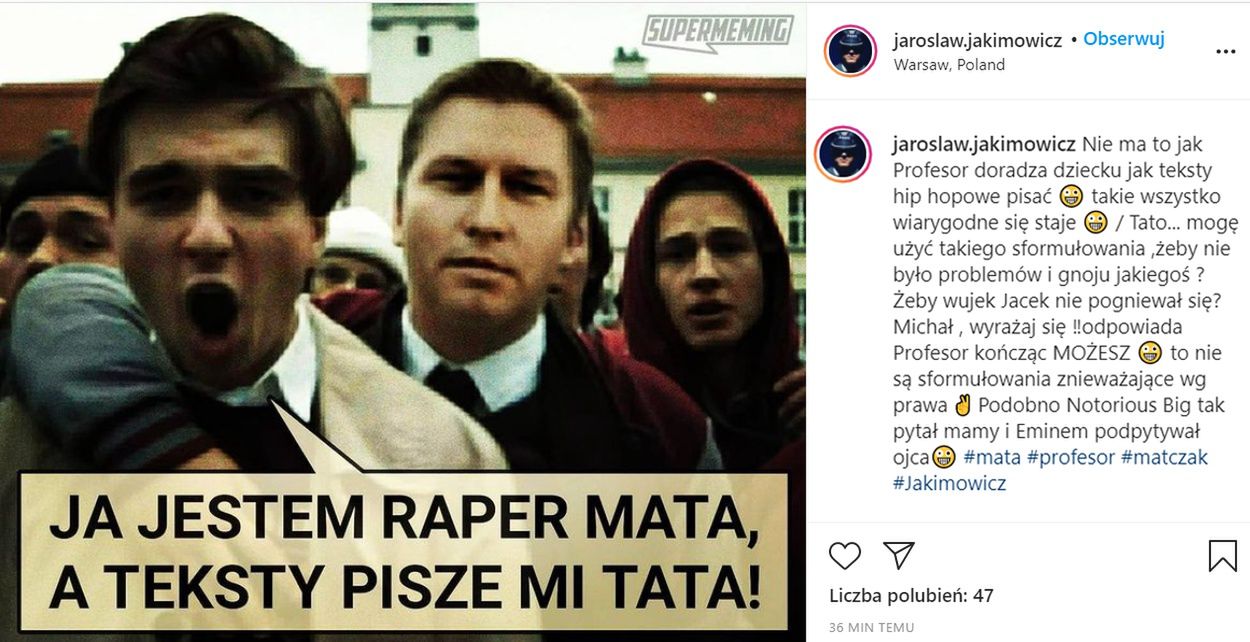 Na tym jednak Jarosław nie poprzestał. Postanowił dodatkowo wyśmiać Matę w najnowszym poście, gdzie zamieścił mem z napisem "Ja jestem raper Mata, a teksty pisze mi tata".