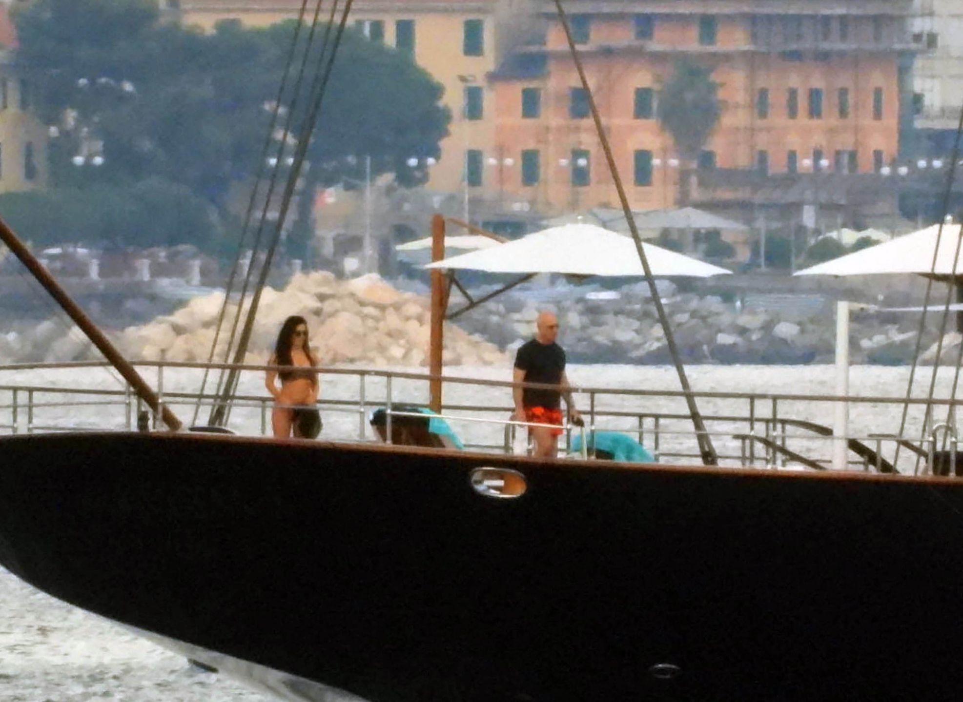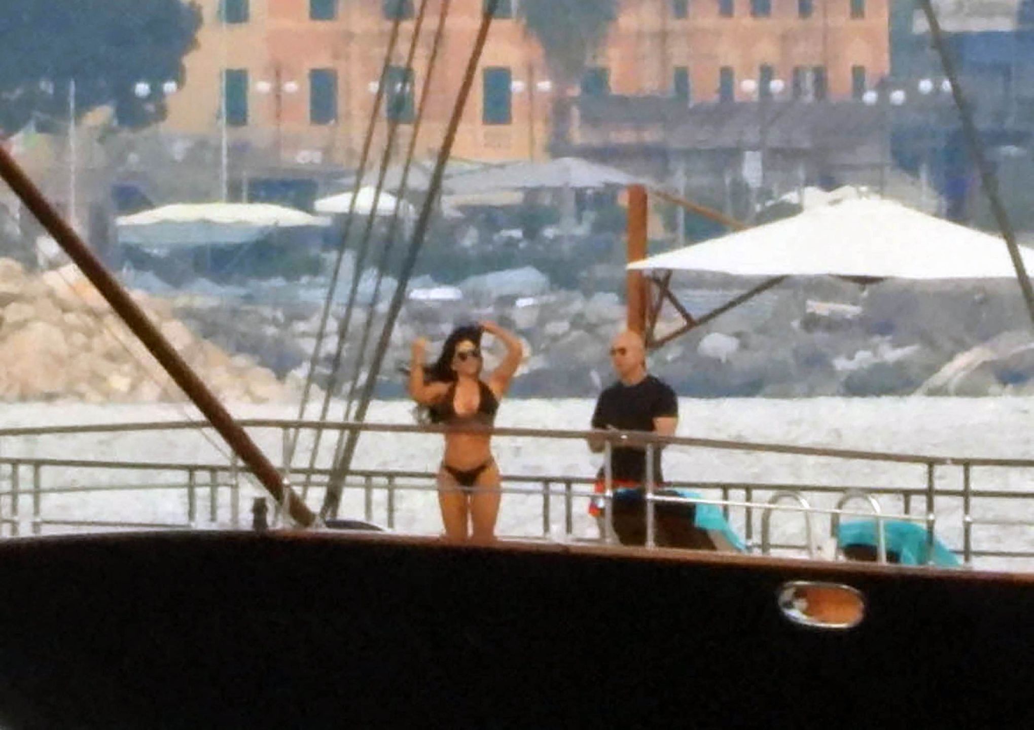 53-letnia celebrytka obnosiła się ze swoją wysportowaną sylwetką w kusym, czarnym dwuczęściowym kostiumie kąpielowym, podczas gdy 59-letni założyciel Amazona miała na sobie klasyczny czarny T-shirt i kolorowe kąpielówki.