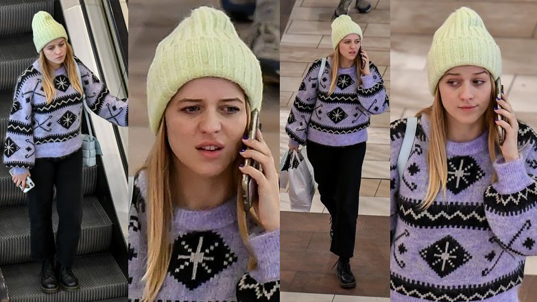 Celebrytka ubrana była w sweter w zimowe wzory, czarne spodnie, glany i pistacjową czapkę.