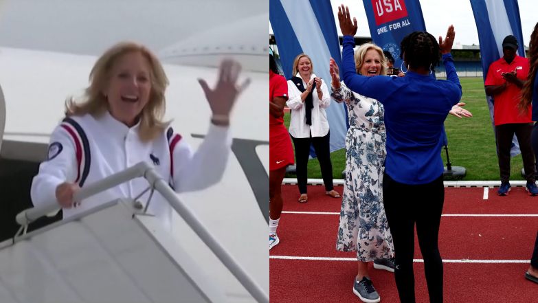 W czwartek Jill Biden wylądowała w stolicy Francji. "Przyłapano" ją, jak przyodziana w białą baseballówkę i fioletowe spodnie wychodzi z samolotu i radośnie macha w stronę fotoreporterów. Następnie pierwsza dama USA spotkała się z amerykańskimi lekkoatletami i wygłosiła przemówienie. Na spotkanie z rodakami założyła "koszulową" sukienkę w motyle i szpilki, które później zamieniła na tenisówki.