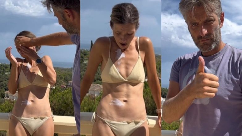 Prezenter pacnął kilka razy żonę dłonią umoczoną w kremie z filtrem, resztki wtarł sobie w brodę i dał znać do kamery, że misja wykonana. Aktorka jednak nie była zbytnio zachwycona i głośno protestowała. A całe nagranie opatrzyła słowami: