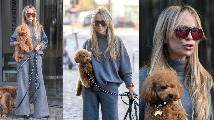 Joanna Przetakiewicz w szarym dresie i ze stadem psów wdzięczy się przed studiem śniadaniówki (ZDJĘCIA)