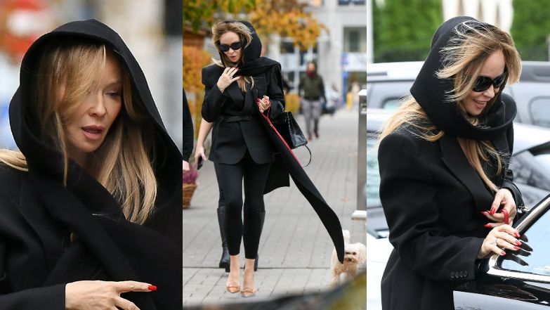 Ubóstwiającą markowe dodatki biznesmenkę napotkano na ulicach Warszawy. Odczuwając skutki chłodnej, jesiennej aury, Joanna owinęła głowę obszernym, czarnym szalem. Gdy pozbawiona makijażu gwiazda zauważyła, że towarzyszą jej paparazzi, szybko wsunęła na nos warte niemal 1900 zł okulary przeciwsłoneczne marki Celine. Przetakiewicz miała tego dnia na sobie czarne legginsy i modną marynarkę w tym samym kolorze, którą przewiązała minimalistycznym paskiem.