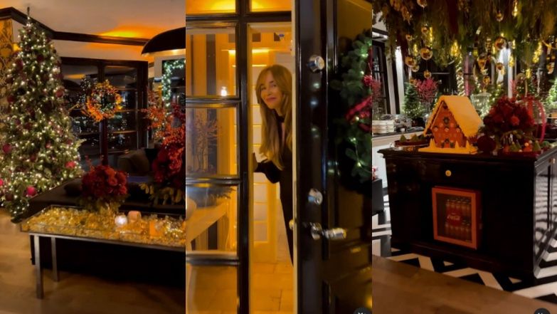 Gwiazda w eleganckim stylu zaprezentowała swoim instagramowym obserwatorom trasę po części jej domu, od progu witając ich w drzwiach, na których znalazł się świąteczny element w postaci okazałego wieńca. Dalej widzowie prowadzeni są w głąb, gdzie uwagę od razu przykuwa oświetlony salon z potężnymi choinkami oraz kolejnymi błyszczącymi wieńcami.