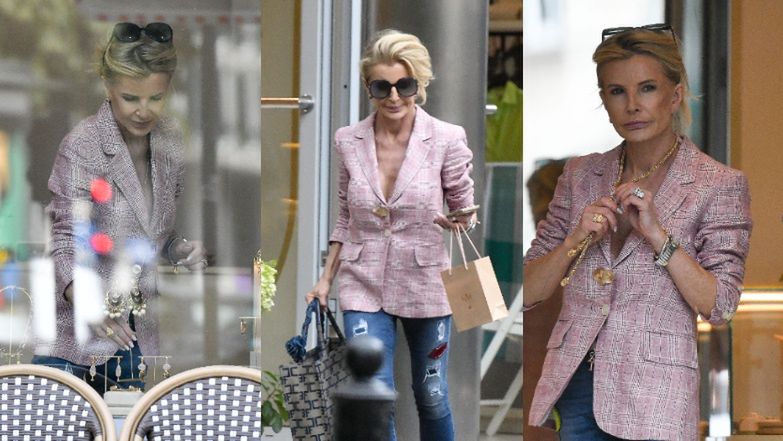 51-latka przy okazji wizyty w butiku nie zapomniała o dopracowanej stylizacji. Tego dnia postawiła na różową marynarkę, dzięki której wyeksponowała dekolt. Dopasowała do niej jeansy z naszywkami i przetarciami, a look uzupełniła trampkami i okularami przeciwsłonecznymi.