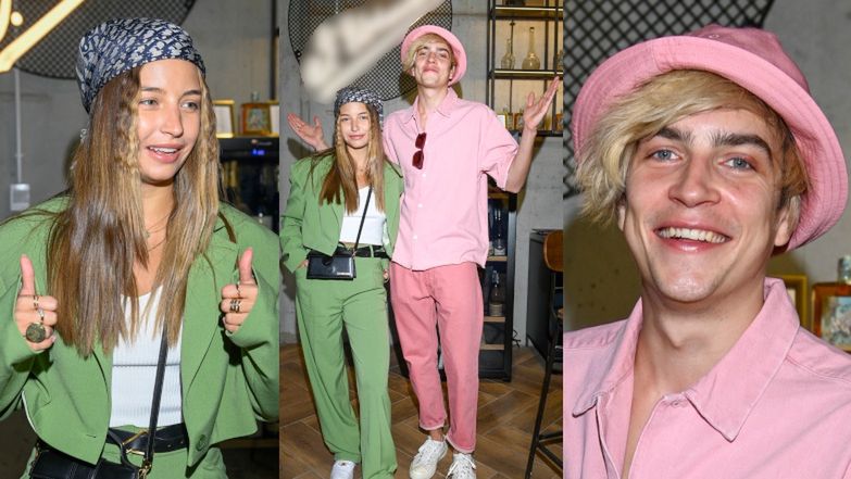Jak na miejsce mające trafiać do klienteli z nieco grubszym portfelem, Wieniawa i Rozbicki wystroili się dość frywolnie. Julka wybrała zielony zestaw ze skróconą marynarką, do którego dobrała czarne skórzane dodatki, w tym torebkę popularnej francuskiej marki Jacquemus oraz chustę od Diora, którą przewiązała rozwianą fryzurę.