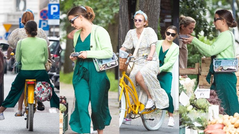 Kasia i Julka zdecydowały się wybrać jeden rower na przejażdżkę, obsadzając Zielińską w roli kierowcy. Obie aktorki postawiły na zwiewne ubrania. Kasia miała na sobie długą sukienkę w kwiaty i modną opaskę w intensywnym kolorze, a Julka kombinezon w odcieniu butelkowej zieleni oraz seledynowy sweterek.