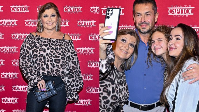 Katarzyna Skrzynecka tryska radością na kolejnej ściance. Zabrała męża, córkę i 28-letnią pasierbicę do teatru