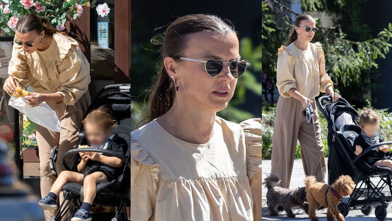 W jeden z upalnych sierpniowych dni Katarzyna Sokołowska została "przyłapana" na ulicach Warszawy. Paparazzi napotkali reżyserkę pokazów mody w pobliżu piekarni, w której 51-latka zaopatrzyła się w drożdżówkę. Gwiazda podzieliła się smakołykiem z towarzyszem spaceru, czyli wspomnianym synkiem. Stołeczne ulice przemierzały z nimi też dwa urocze pieski. Jurorka "Top Model" jak zwykle zadbała o elegancką stylizację. Tego dnia miała na sobie szerokie, beżowe spodnie i kremową bluzkę z falbanami. Codzienny "look" uzupełniły czarne baleriny i okulary przeciwsłoneczne w kształcie serc.