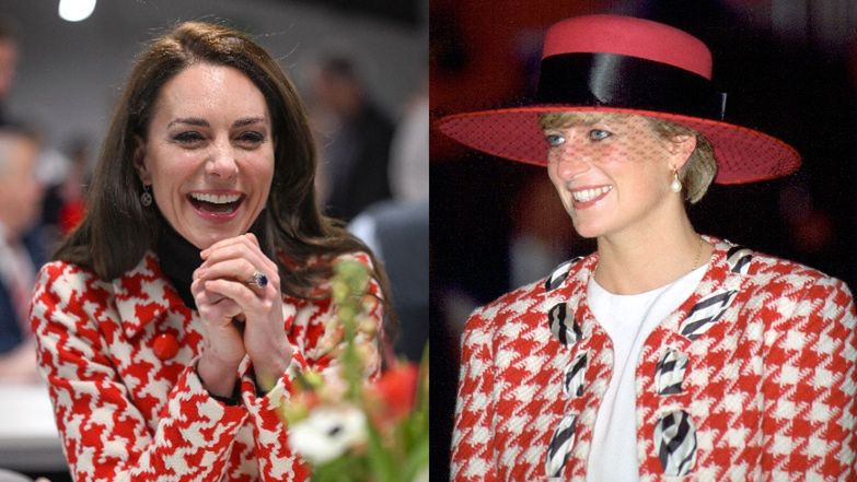 Nie jest tajemnicą, że Kate lubi inspirować się matką Williama w swoich outfitach, czym też udało jej się zabłysnąć w sobotę podczas pucharowych rozgrywek rugby. Middleton pokazała się tam w biało czerwonym płaszczu w pepitkę, który na myśl przywoływał dawną kreację "królowej ludzkich serc".